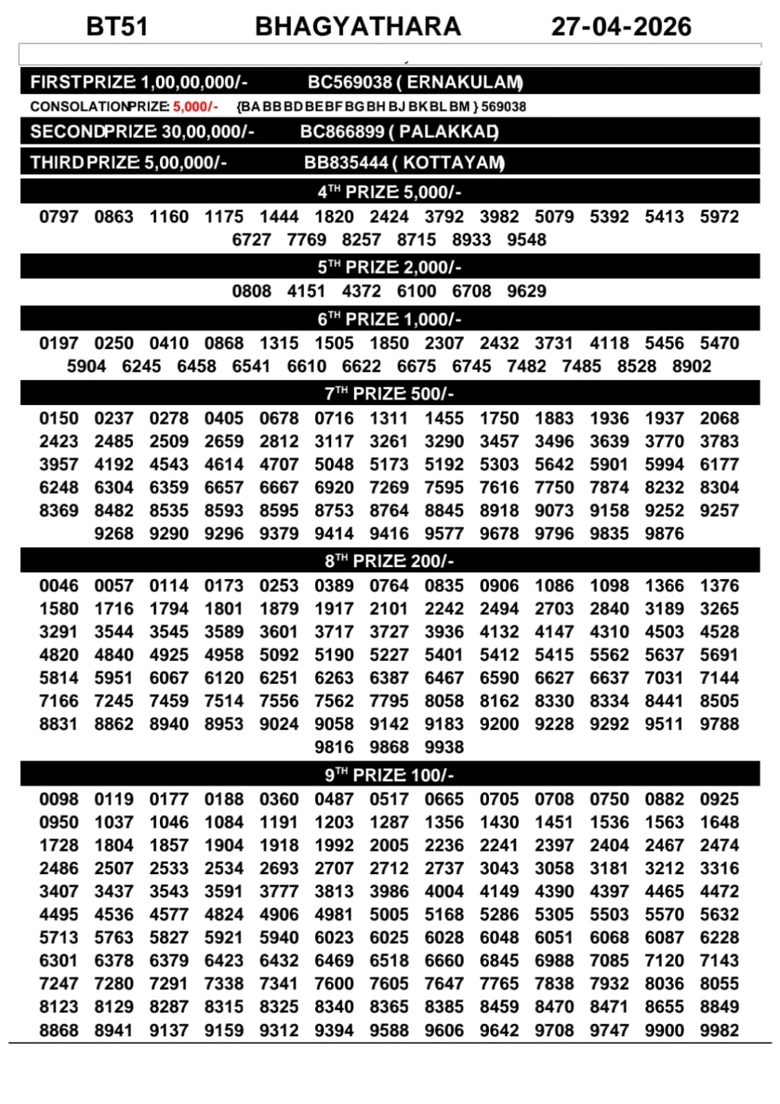 Kerala Lottery Result Bhagyathara — Live Result Coverage for 27/04/26
