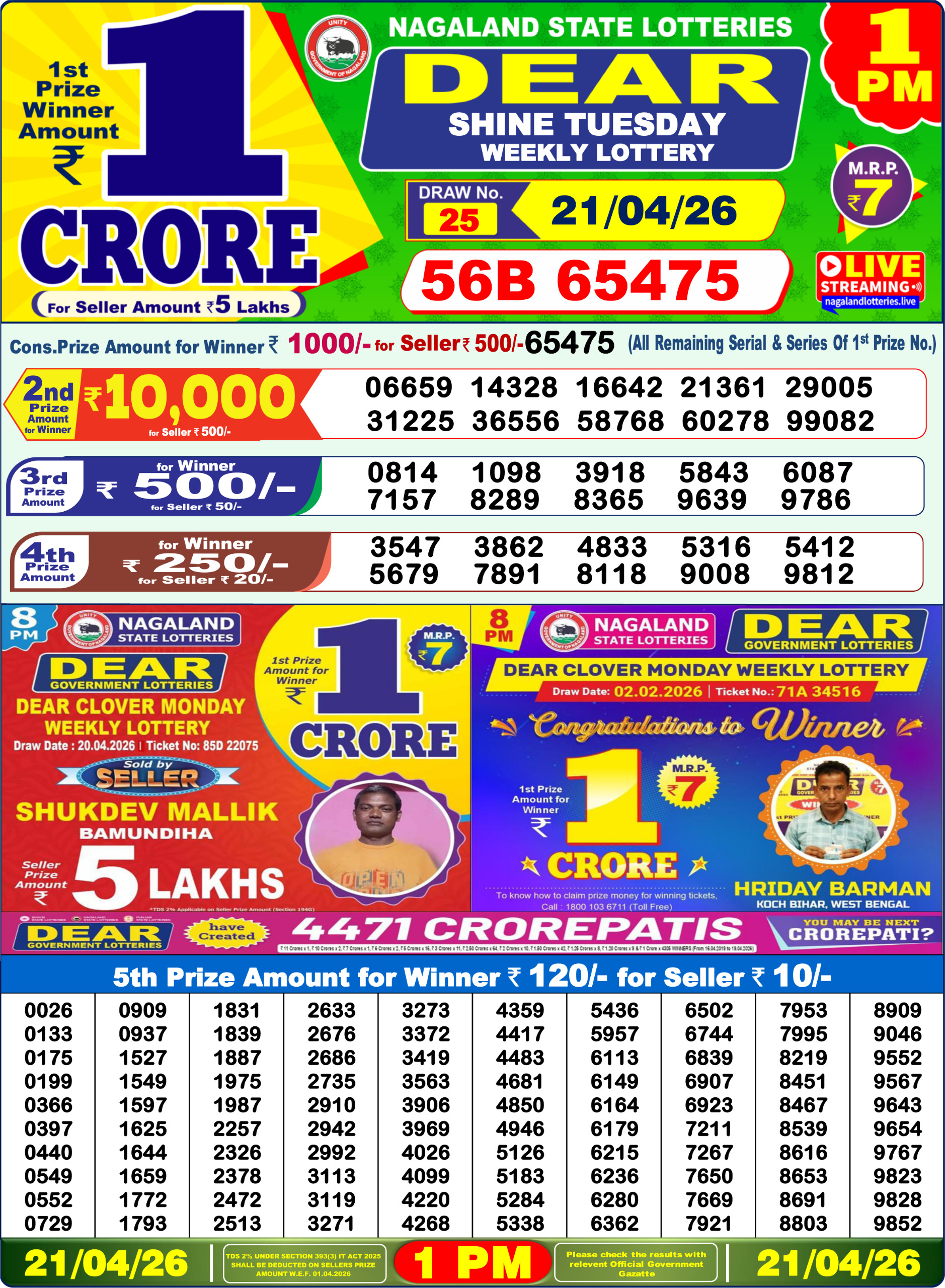 Dear Shine Tuesday Weekly Lottery is the scheduled scheme for 21/04/26. This live result story is covering the 1 PM draw for Nagaland. Key details: ticket price ₹7, 1st prize ₹1 Crore. Nagaland Lottery Result, Lottery Sambad update for today.
