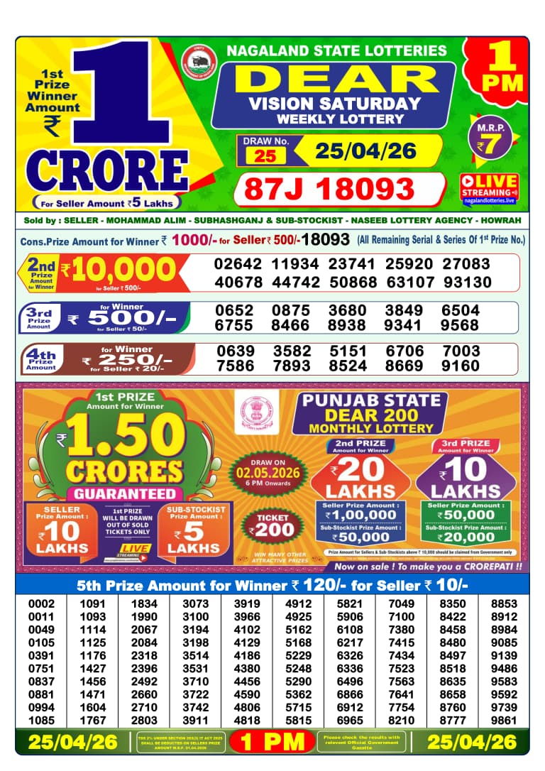 Dear Vision Saturday Weekly Lottery is the scheduled scheme for 25/04/26. This live result story is covering the 1 PM draw for Nagaland. Key details: ticket price ₹7, 1st prize ₹1 Crore. Nagaland Lottery Result, Lottery Sambad update for today.