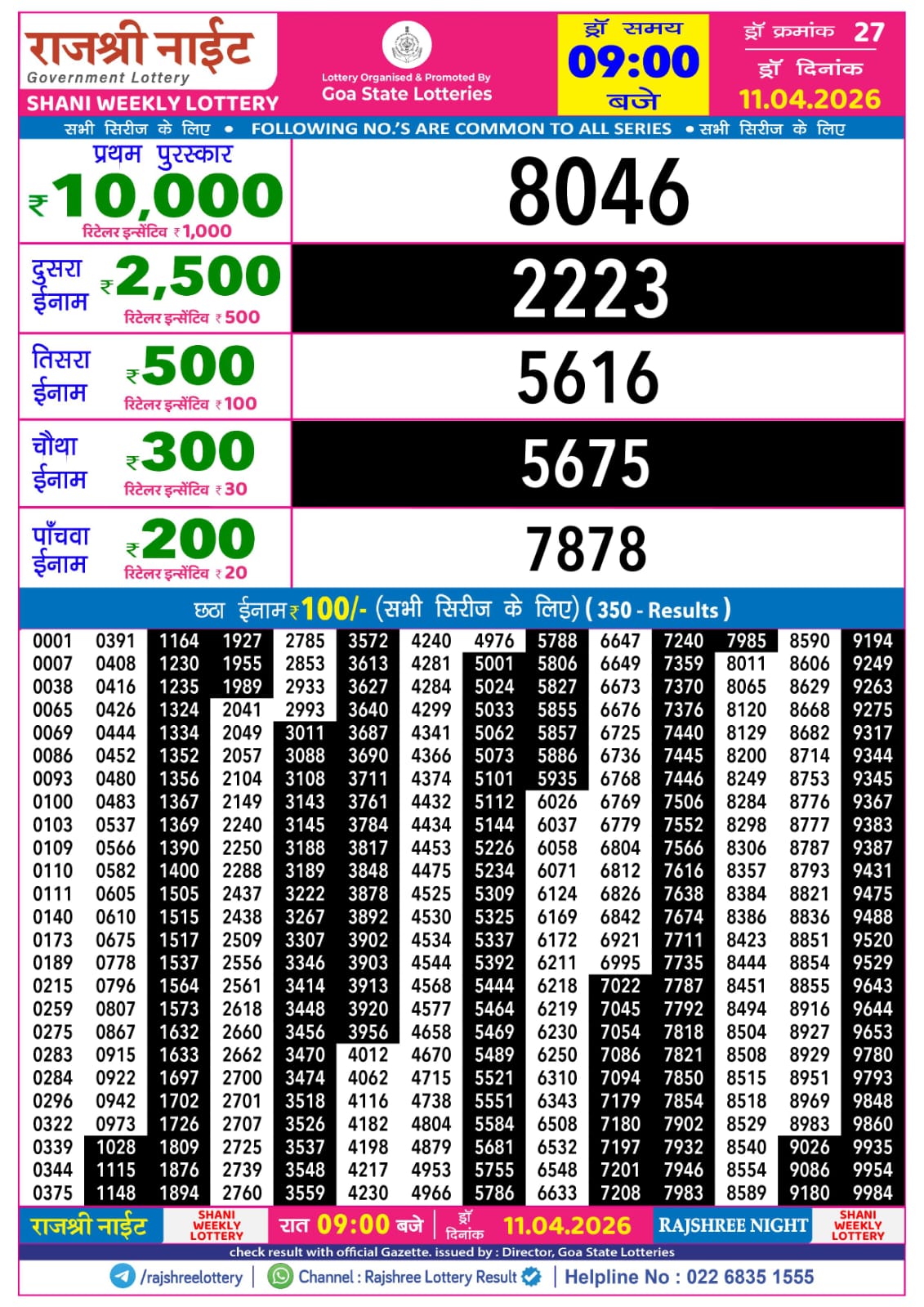 Rajshree Night Shani Weekly Lottery — Live Result Coverage for 11/04/26