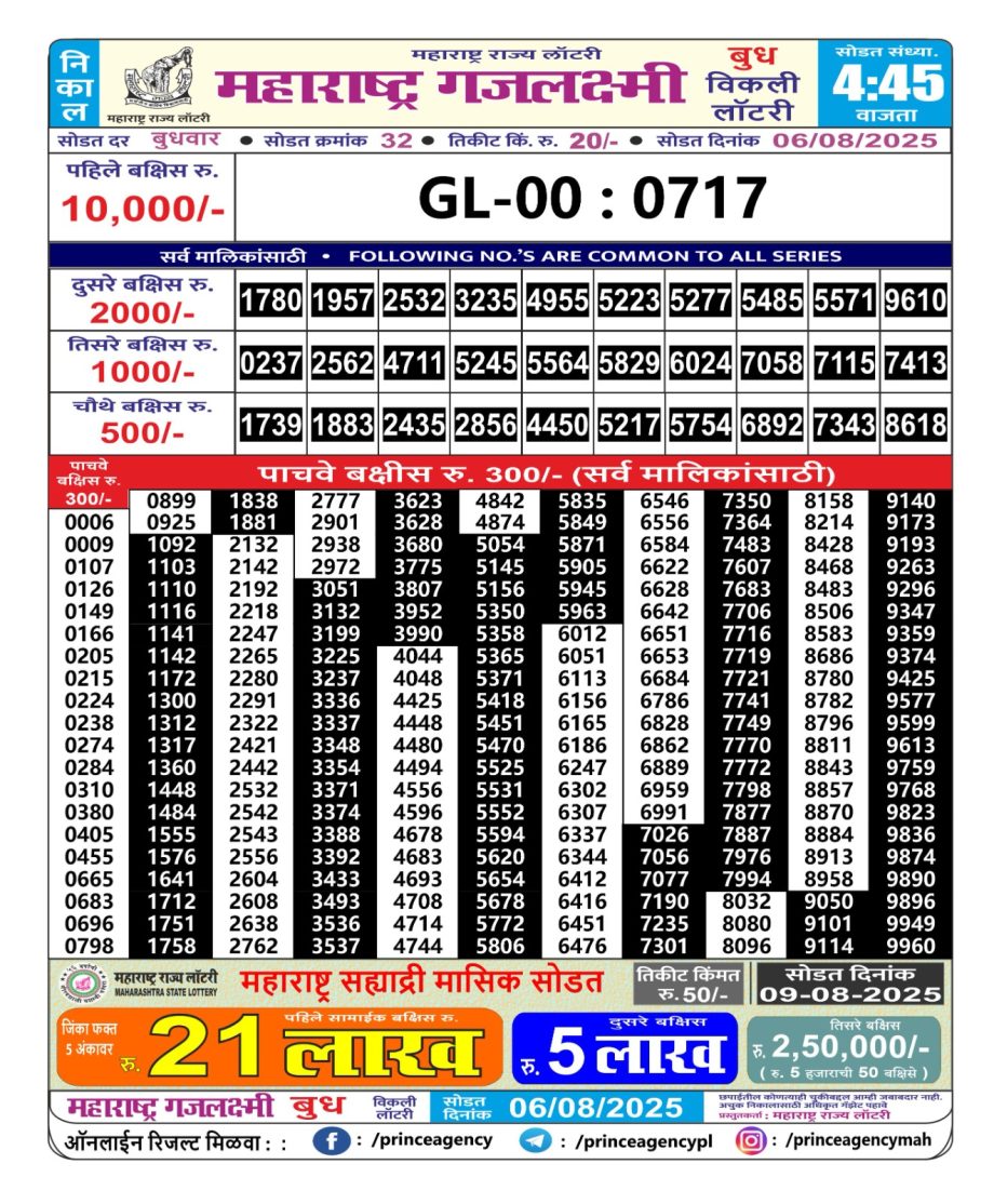 Maharashtra State Lottery Gajlaxmi Results 4.45 PM Draw 06/08/25 Leave a Comment on Maharashtra State Lottery Gajlaxmi Results 4.45 PM Draw 06/08/25