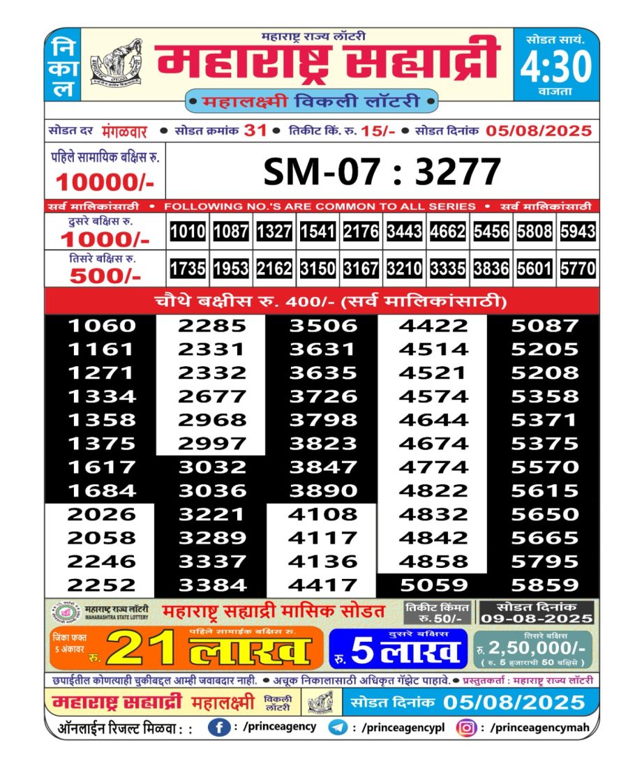 Maharashtra State Lottery Mohini Results 4.30 PM Draw 05/08/25 Leave a Comment on Maharashtra State Lottery Mohini Results 4.30 PM Draw 05/08/25