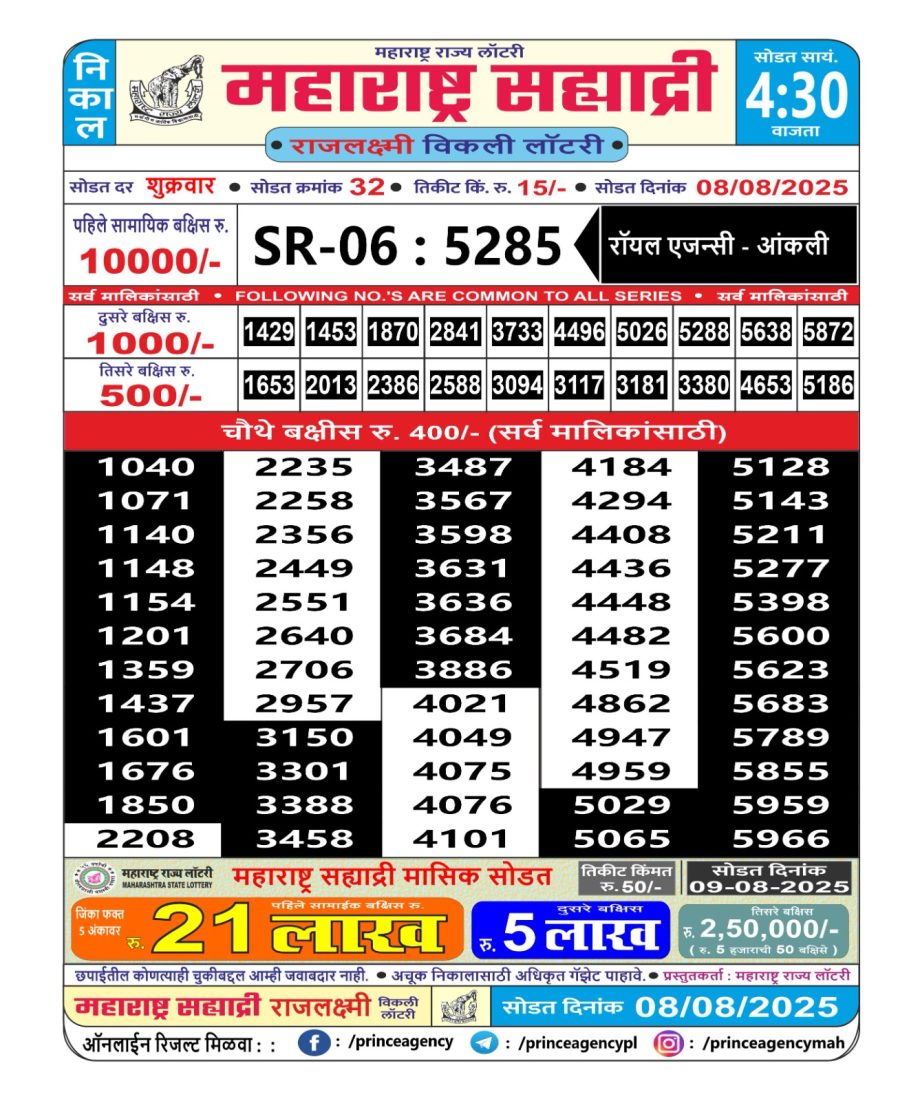 Maharashtra State Lottery Mohini Results 4.30 PM Draw 08/08/25 Leave a Comment on Maharashtra State Lottery Mohini Results 4.30 PM Draw 08/08/25