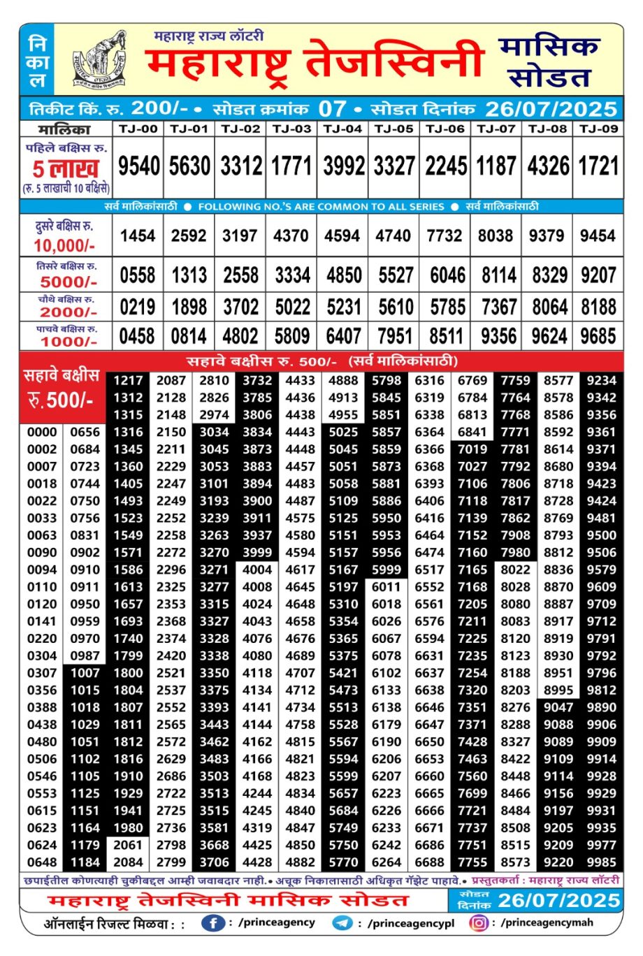 Maharashtra Tejaswini monthly lottery result 26/07/25