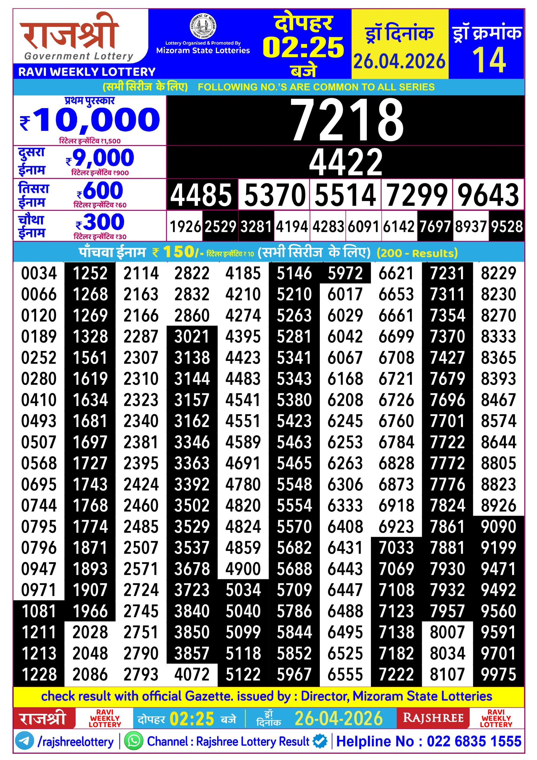 Rajshree Ravi Weekly Lottery — Live Result Coverage for 26/04/26