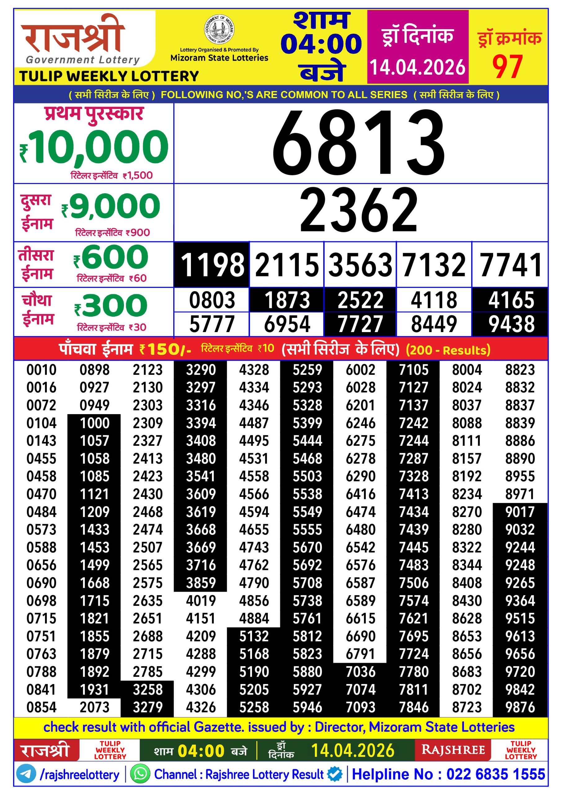 Rajshree Tulip Weekly Lottery is the scheduled scheme for 14/04/26. This live result story is covering the 4 PM draw for Mizoram. Key details: ticket price ₹12, 1st prize ₹10,000. Mizoram Lottery Result update for today.