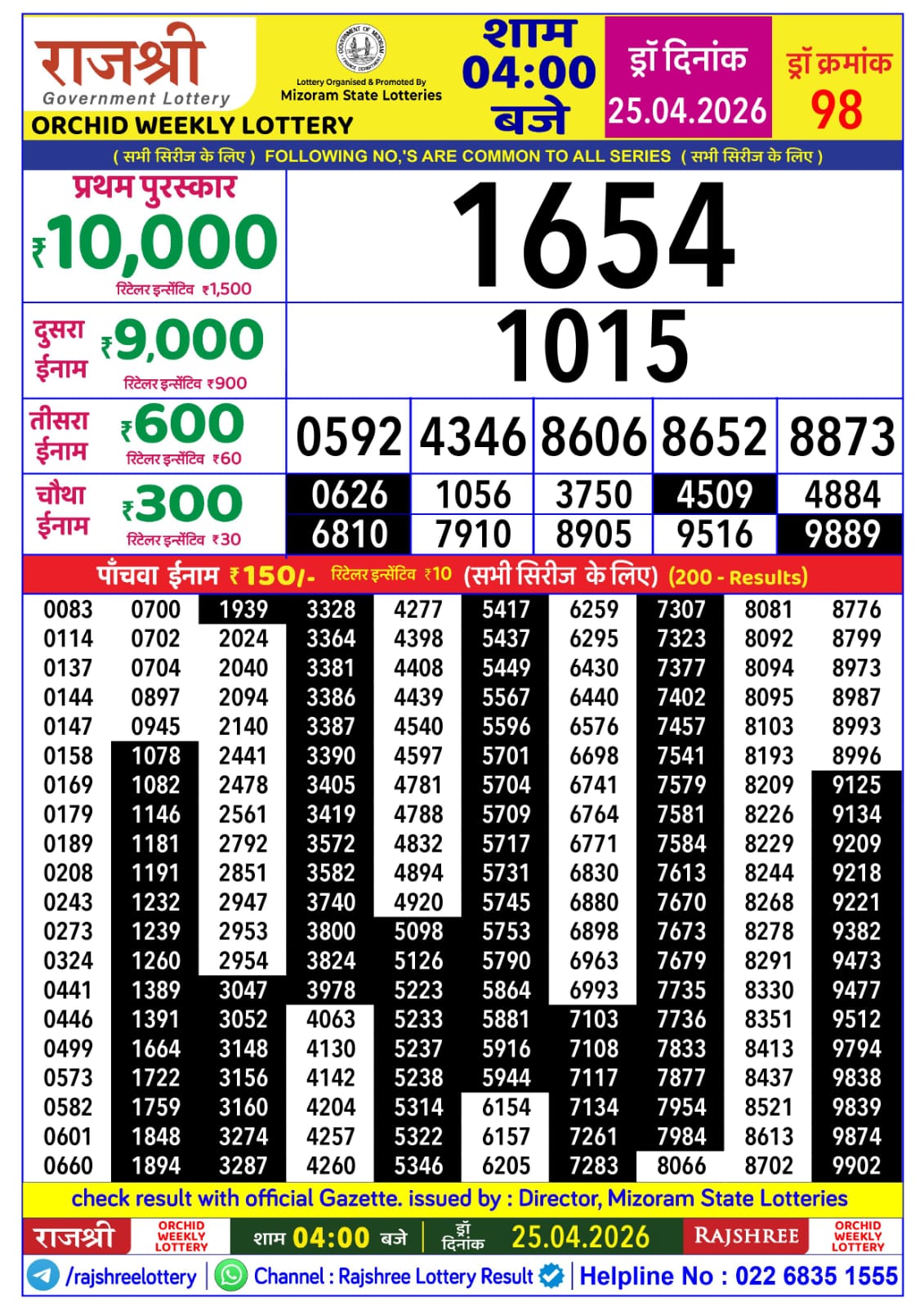 Rajshree Orchid Weekly Lottery is the scheduled scheme for 25/04/26. This live result story is covering the 4 PM draw for Mizoram. Key details: ticket price ₹12, 1st prize ₹10,000. Mizoram Lottery Result update for today.