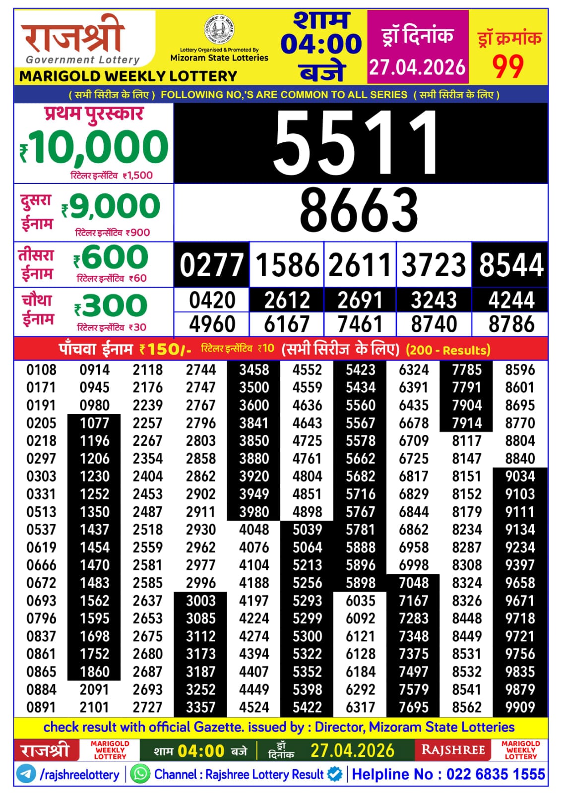 Rajshree Marigold Weekly Lottery — Live Result Coverage for 27/04/26