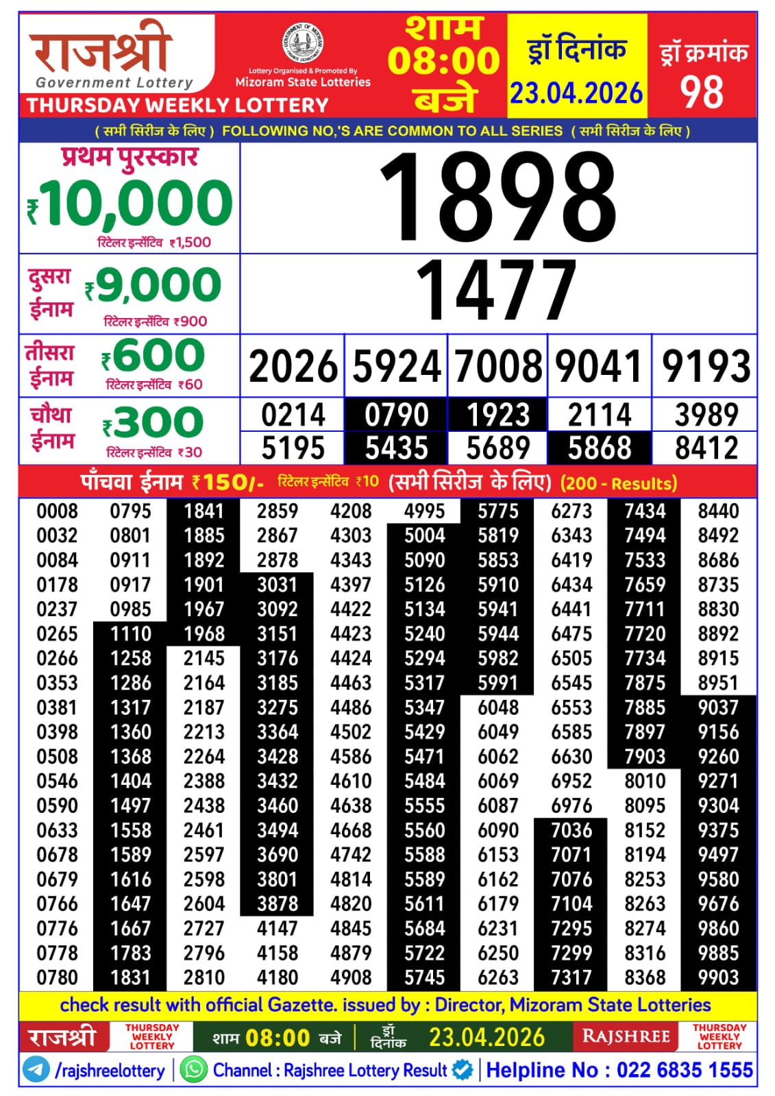 Rajshree Thursday Weekly Lottery is the scheduled scheme for 23/04/26. This live result story is covering the 8 PM draw for Mizoram. Key details: ticket price ₹12, 1st prize ₹10,000. Mizoram Lottery Result update for today.