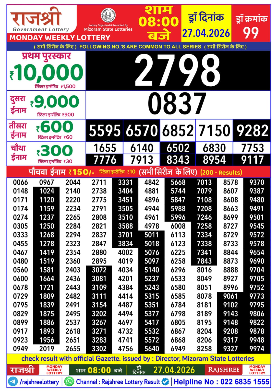 Rajshree Monday Weekly Lottery is the scheduled scheme for 27/04/26. This live result story is covering the 8 PM draw for Mizoram. Key details: ticket price ₹12, 1st prize ₹10,000. Mizoram Lottery Result update for today.